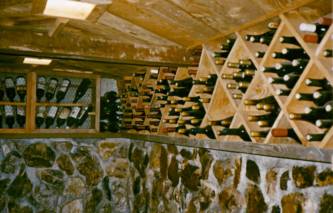 Rough milled wood from estate timber accent this 240 square foot private wine cellar in the foothills of Napa Valley, the stone of which, specially selected from wine cave excavations.